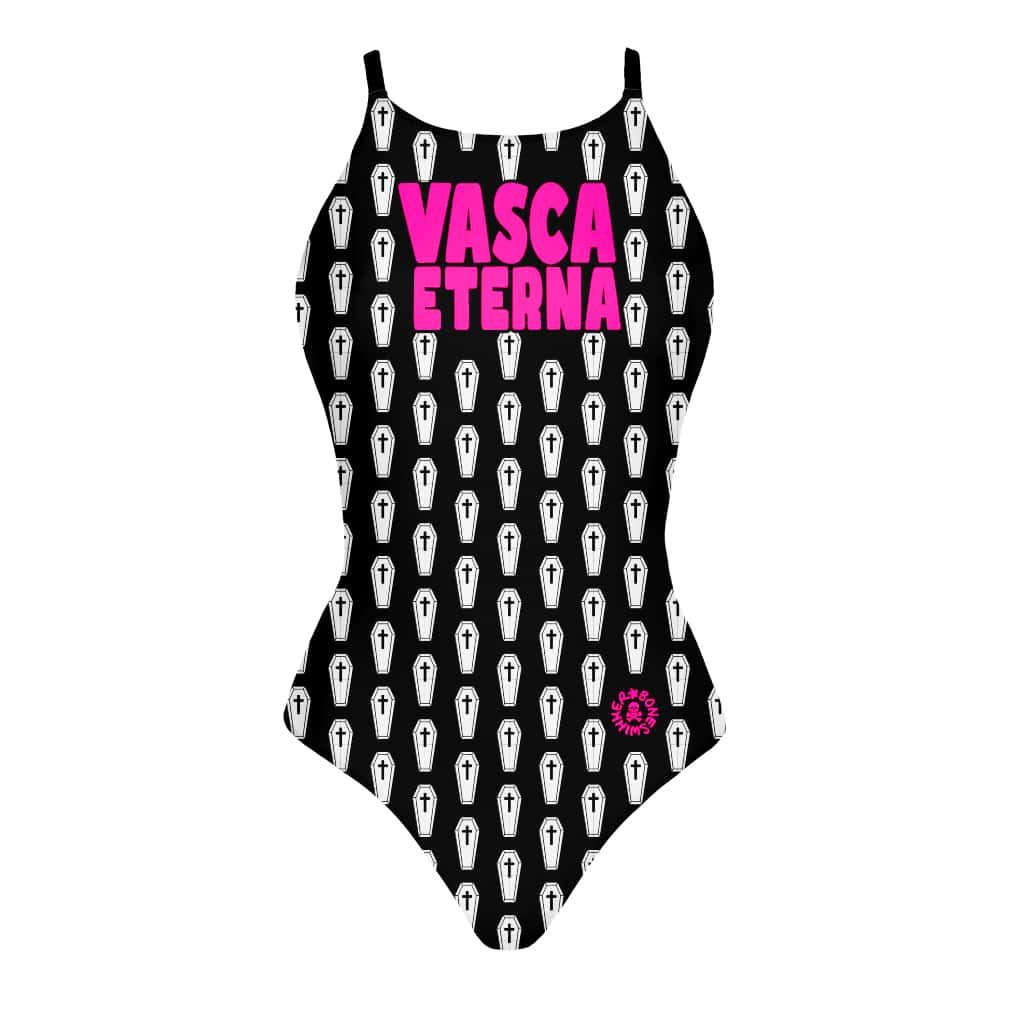 Style : le style du maillot est résolument ironique et joue sur un motif graphique élégamment noir et blanc. Sauf que l’élément graphique répété est un petit cercueil stylisé. La phrase « Vasque éternelle » joue avec la sensation que chaque nageur a éprouvée, d’un bassin qui ne finit jamais, et la similitude d’un cercueil comme s’il s’agissait d’une baignoire où rester pour l’éternité. Le concept fait un clin d’œil au contexte de la natation en piscine de Boneswimmer, qui dans ses éléments iconiques tels que les squelettes, les crânes et les os, possède déjà une tradition iconographique en harmonie.