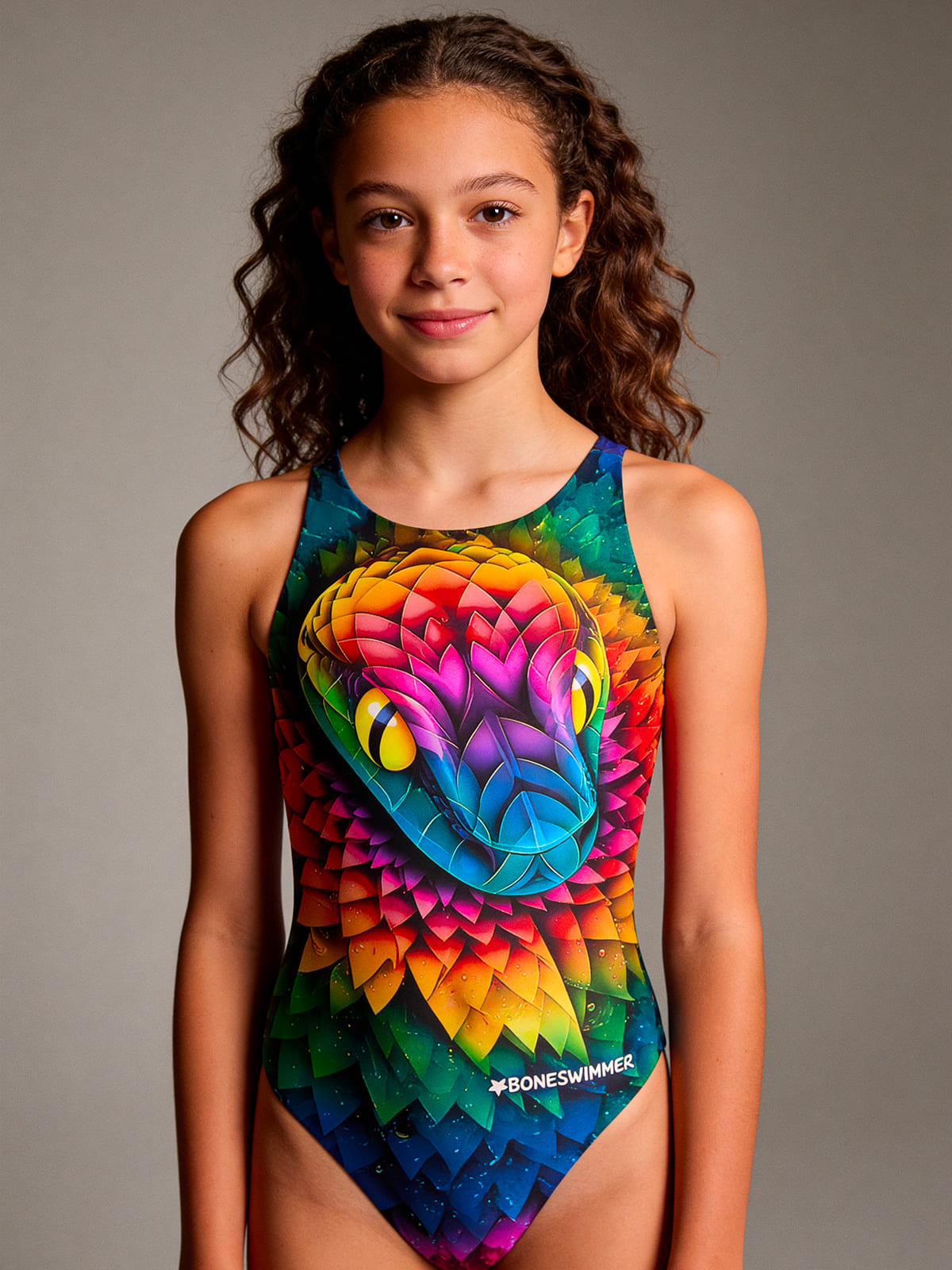 Imprimé "Samba". Écailles arc-en-ciel, nuances vives, serpent au regard intense.