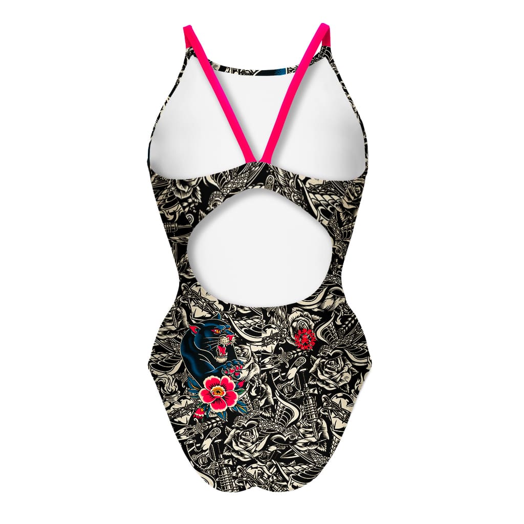 Maillot une pièce d'entraînement, modèle Ibiza. Imprimé "Tattoo" : pop art, contraste des couleurs tattoo, panthère avec fleur rouge vif.