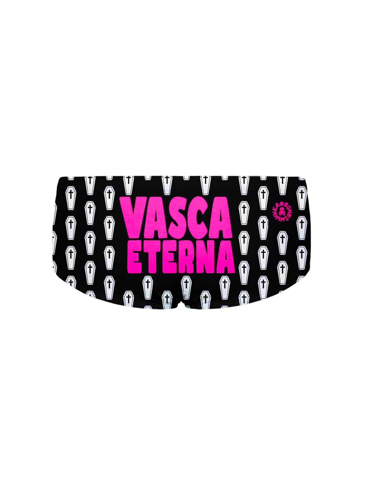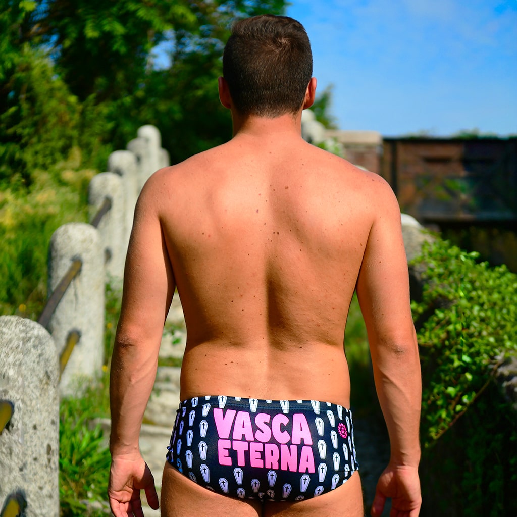 Style : le style du maillot est résolument ironique et joue sur un motif graphique élégamment noir et blanc. Sauf que l’élément graphique répété est un petit cercueil stylisé. La phrase « Bassin éternel » joue avec la sensation que chaque nageur a éprouvée, d’un bassin qui ne finit jamais, et la similitude d’un cercueil comme s’il s’agissait d’une baignoire où rester pour l’éternité. Le concept fait un clin d’œil au contexte de la natation en piscine de Boneswimmer, qui dans ses éléments iconiques tels que les squelettes, les crânes et les os, possède déjà une tradition iconographique en harmonie.