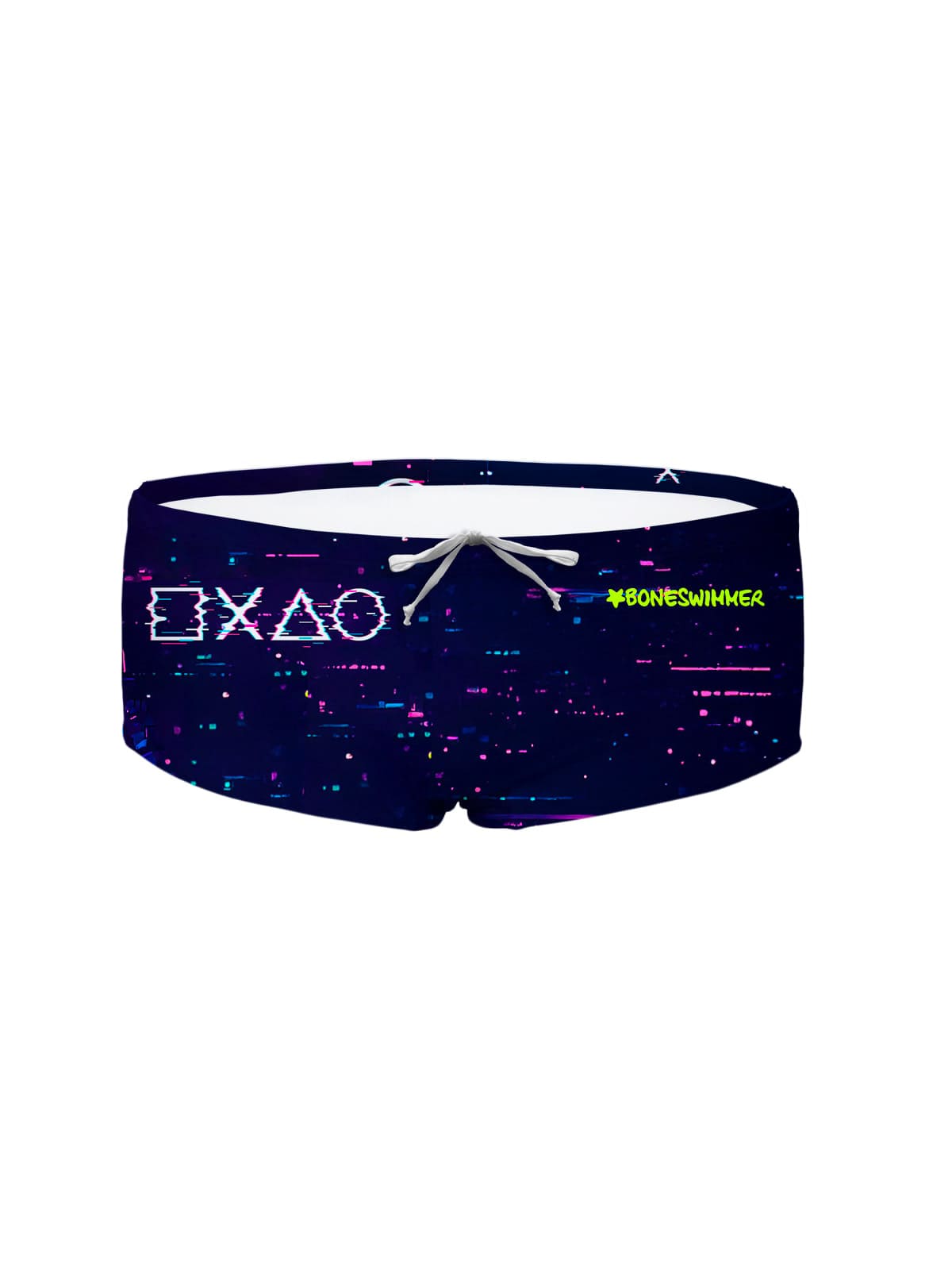 Maillot de bain homme mi-cuisses d’entraînement, modèle Ucla. Imprimé "Gamer" : une esthétique glitch inspirée du cyberpunk avec des symboles et des couleurs néon, pour une présence audacieuse et urbaine dans le bassin.