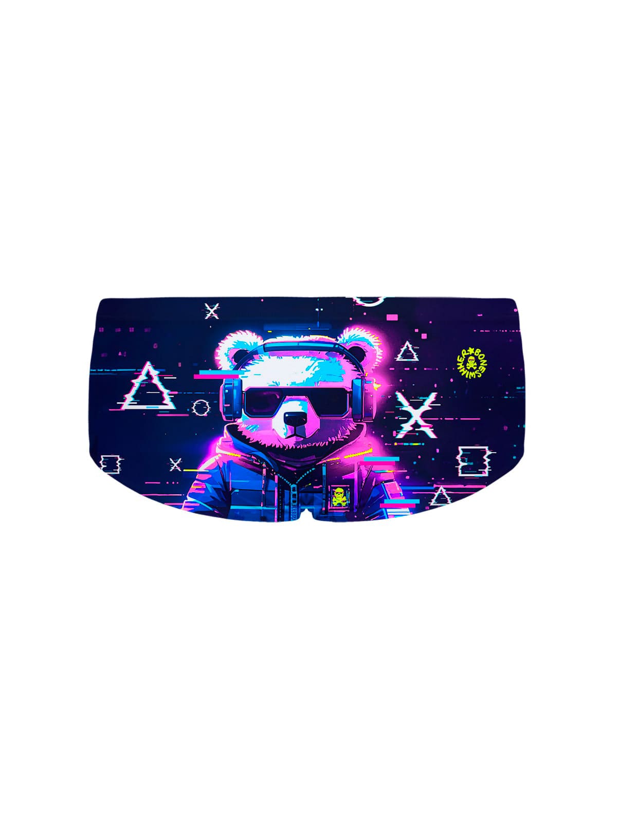 Le graphisme fait un clin d'œil à la culture digitale et au monde des jeux vidéo, avec une esthétique glitch inspirée du cyberpunk. Les symboles et les couleurs néon, allant du violet à l’azur électrique jusqu’au fuchsia vif, créent un effet futuriste rappelant des ambiances nocturnes et urbaines. Au dos, se détache l’illustration d’un ours avec casque et lunettes, une icône ironique et audacieuse.