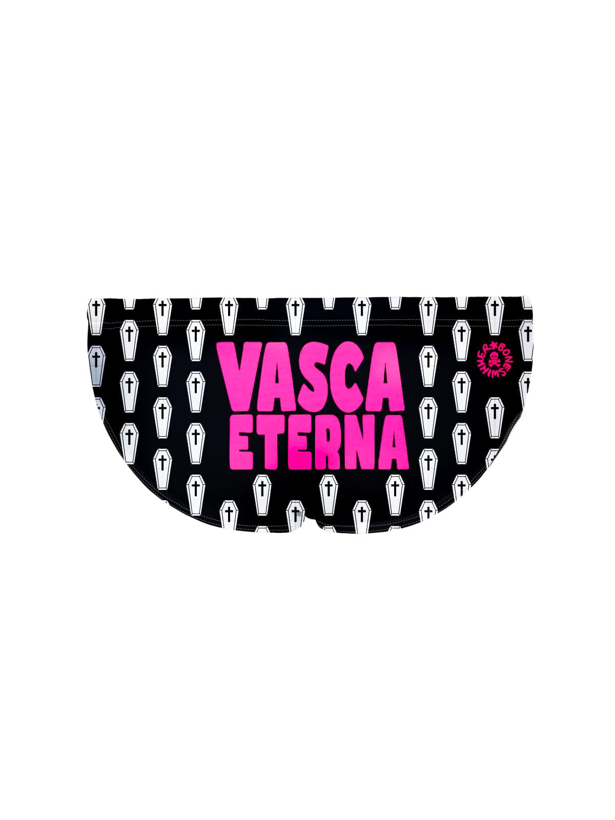 Impression "Eterna". Le style du maillot est ironique et joue sur un motif graphique élégamment noir et blanc.