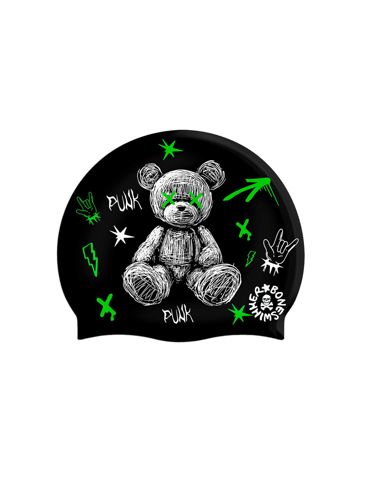 Impression : un petit ours style acid punk, dessiné graphiquement sur un fond noir entouré de signes et traits vert fluo.