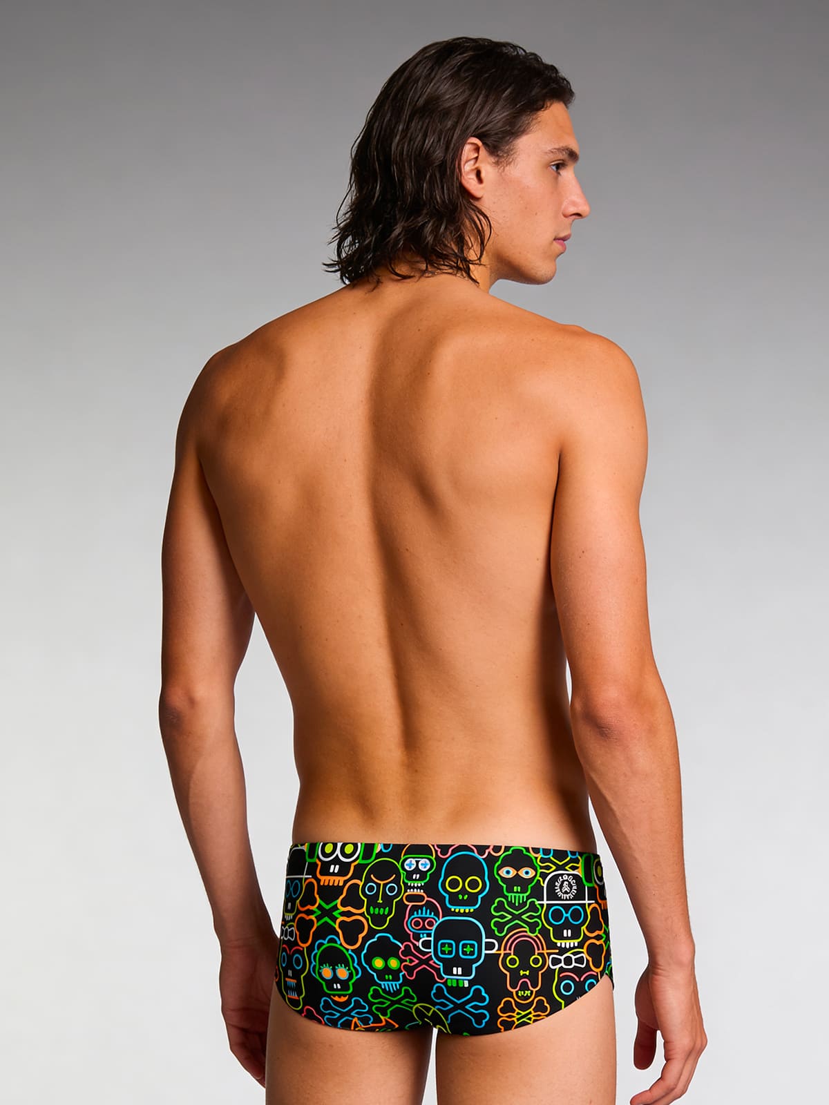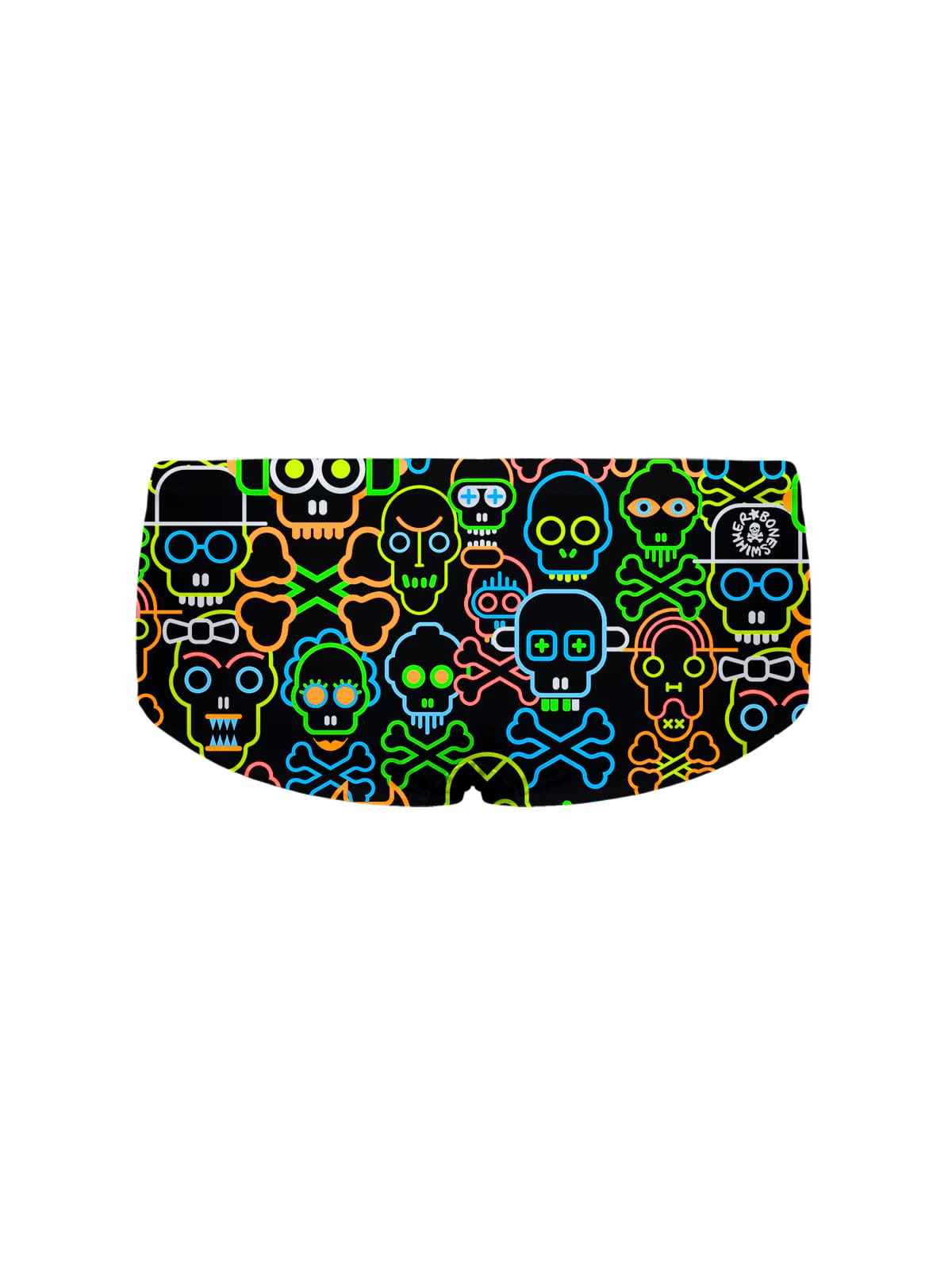 Maillot boxer d'entraînement, modèle Ucla. Imprimé “Skull tribe” : motif tribal, contour de crânes néon, couleurs fluo évocatrices.