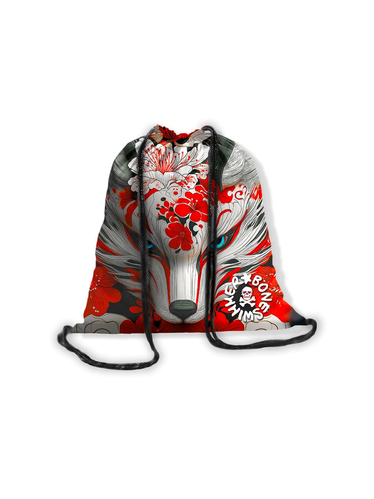 Impression : un renard, animal magique de la mythologie japonaise représentant la beauté et la ruse parmi des fleurs rouges et blanches ; un accessoire essentiel et confortable pour votre sac de piscine.